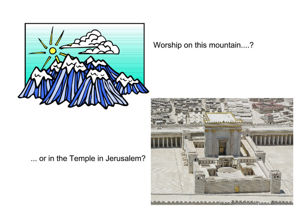 The woman’s question was a leading one, really. She was trying to get Jesus into an old argument between Jews and Samaritans. The two both derived their religion from that of Abraham, so there was no doubt that they worshiped the same, one, true God, but each claimed their sacred hill as the one on which Abraham had nearly sacrificed Isaac.[i] Each once had an ancient temple that had been destroyed: The Jewish temple in Jerusalem was still in the process of being rebuilt, a vast and magnificent building for its priests, singers and complex rules about sacrifice and prayers. The Samaritans hadn’t rebuilt theirs and we know little about how they worshiped at the time.